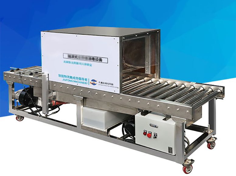消毒設備主要有動力滾筒鏈輪傳送模塊、微酸性次氯酸水霧化模塊、噴淋係統加熱模塊和控製模塊組成;動力滾筒鏈輪傳送模塊,主要傳輸食品包裝箱,輸送口安裝傳感裝置,包裝箱矯正裝置、傳動速度可根據需要做調整。水霧化模塊是對食品包裝箱消毒,其中的霧化量可根據需求調整。內部安裝16個霧化噴頭,做到六麵消毒。噴淋係統加熱模塊,是對霧化模塊的加熱,避免像冷鏈食品行業當中冷庫溫度低,使霧化噴頭結冰,無法進行工作。控製模塊主要對整個係統進行控製,按照需求運行。